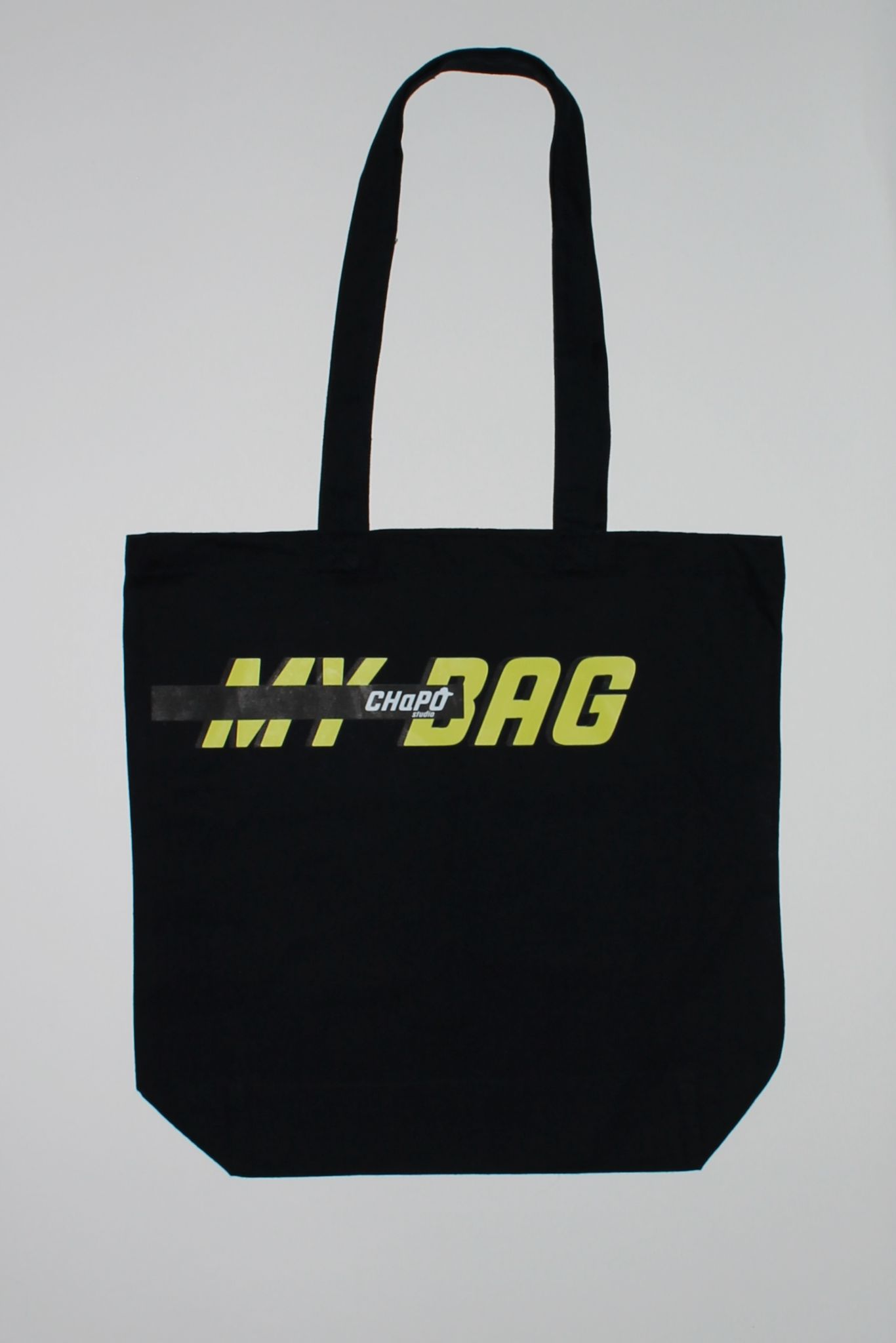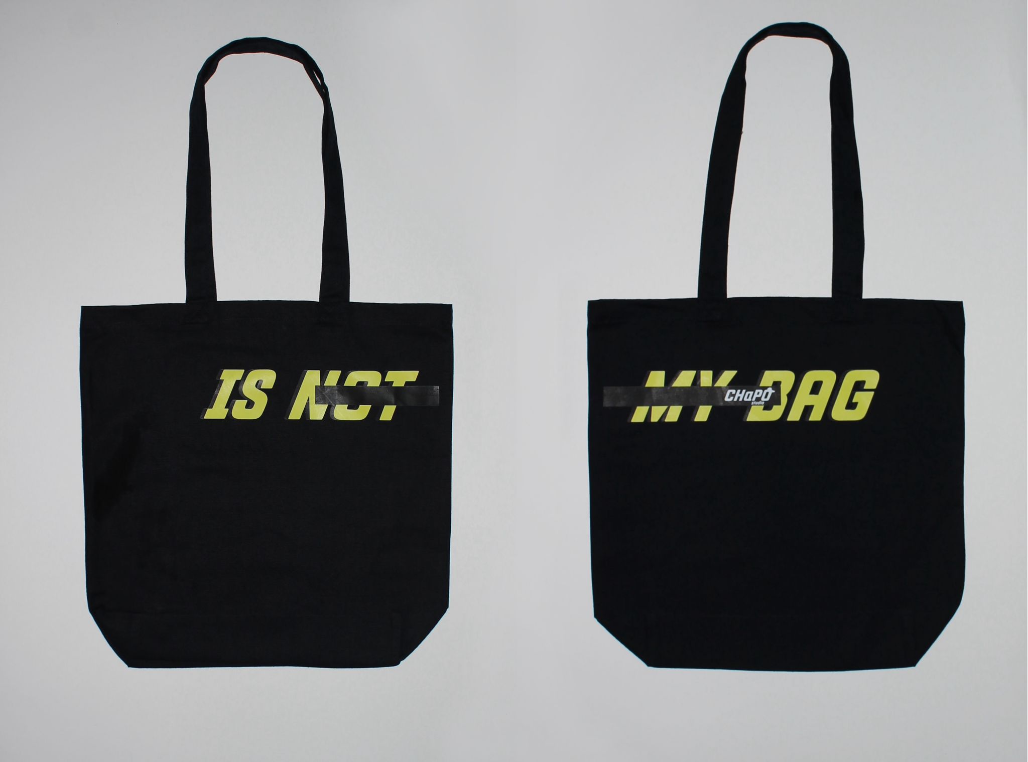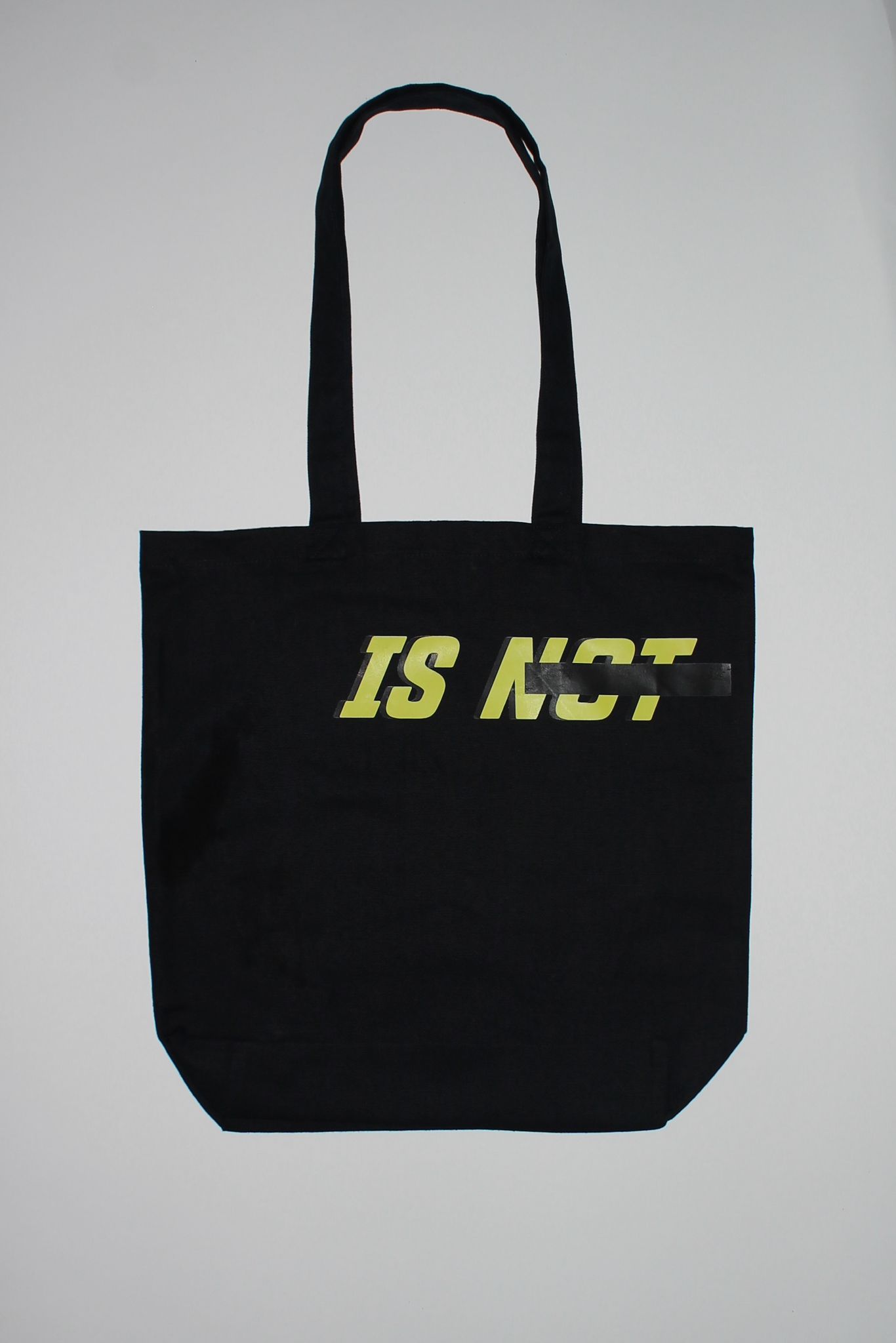 ote bag “IS NOT MY BAG” en lona negra resistente.